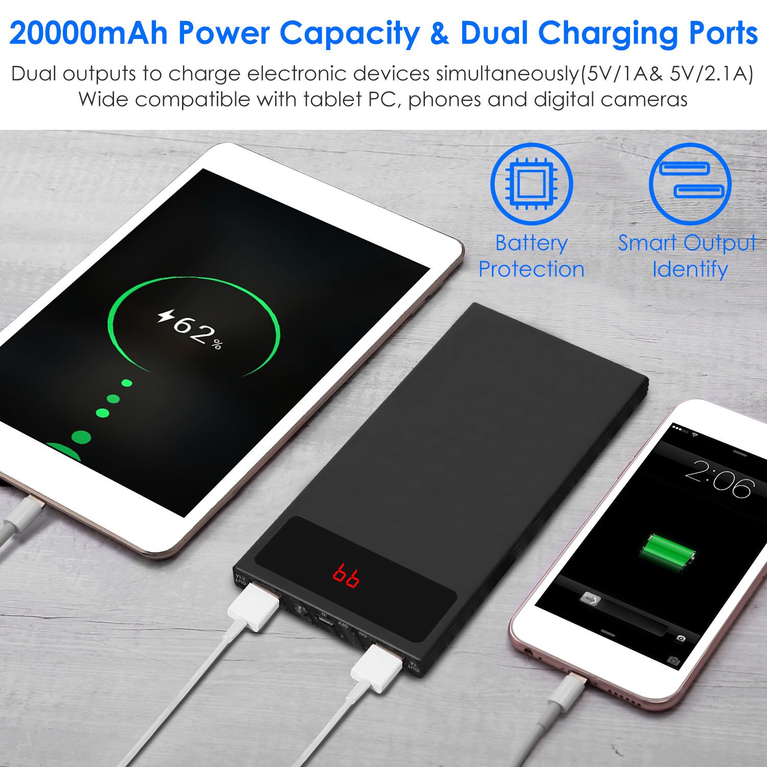 **RELIABLE DUAL CHARGING SOLUTION*:Our 20000mAh power bank detects your device automatically and enables to charge 2 electronic devices simultaneously at full speed(2.1A+1A); share the charging ports with your family or friends conveniently. Note:Electric loss may happen in the whole charging process and the recharging times depend on your devices and other factors.