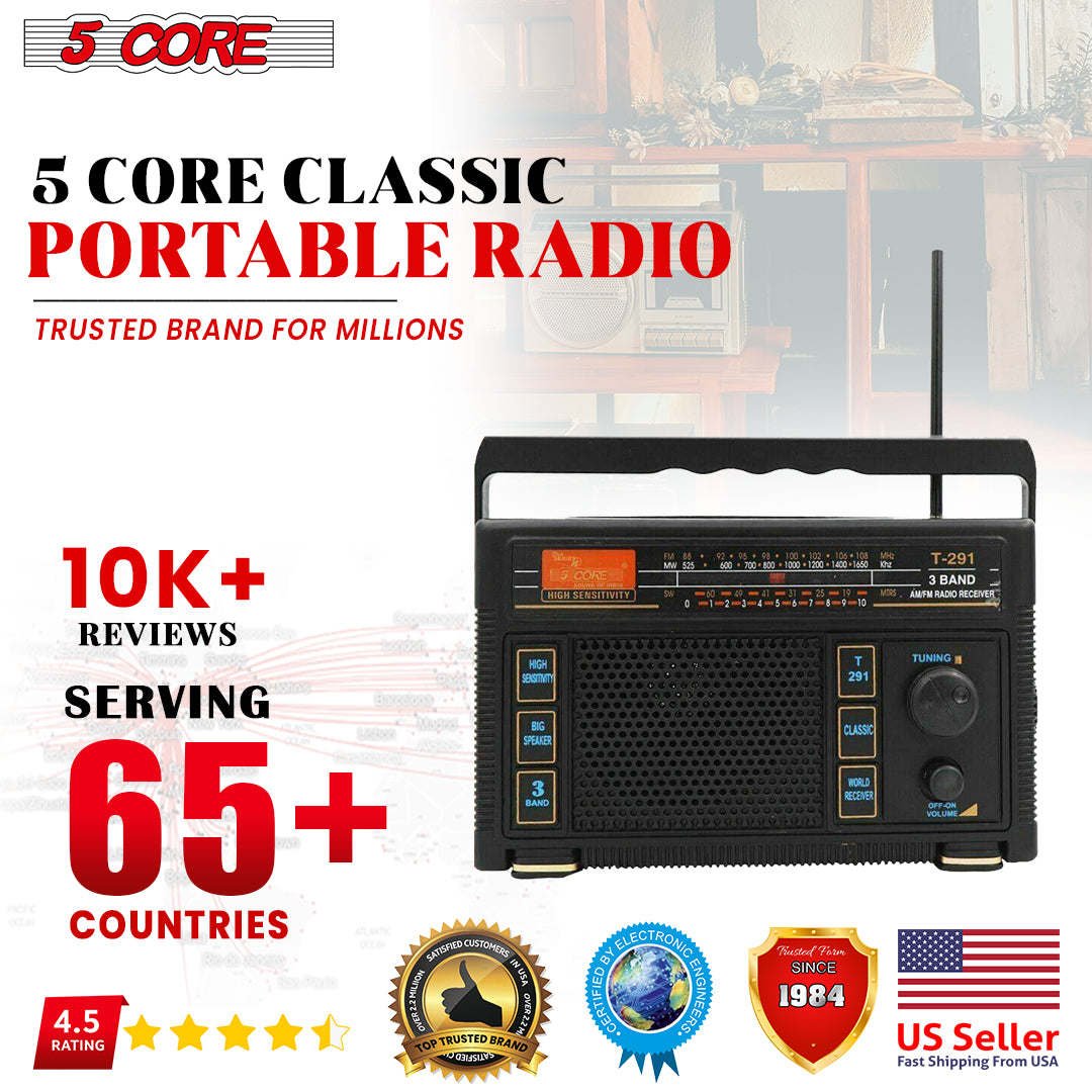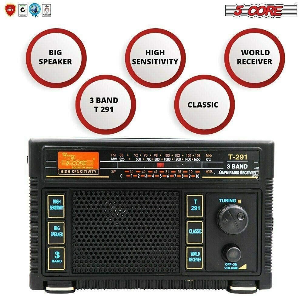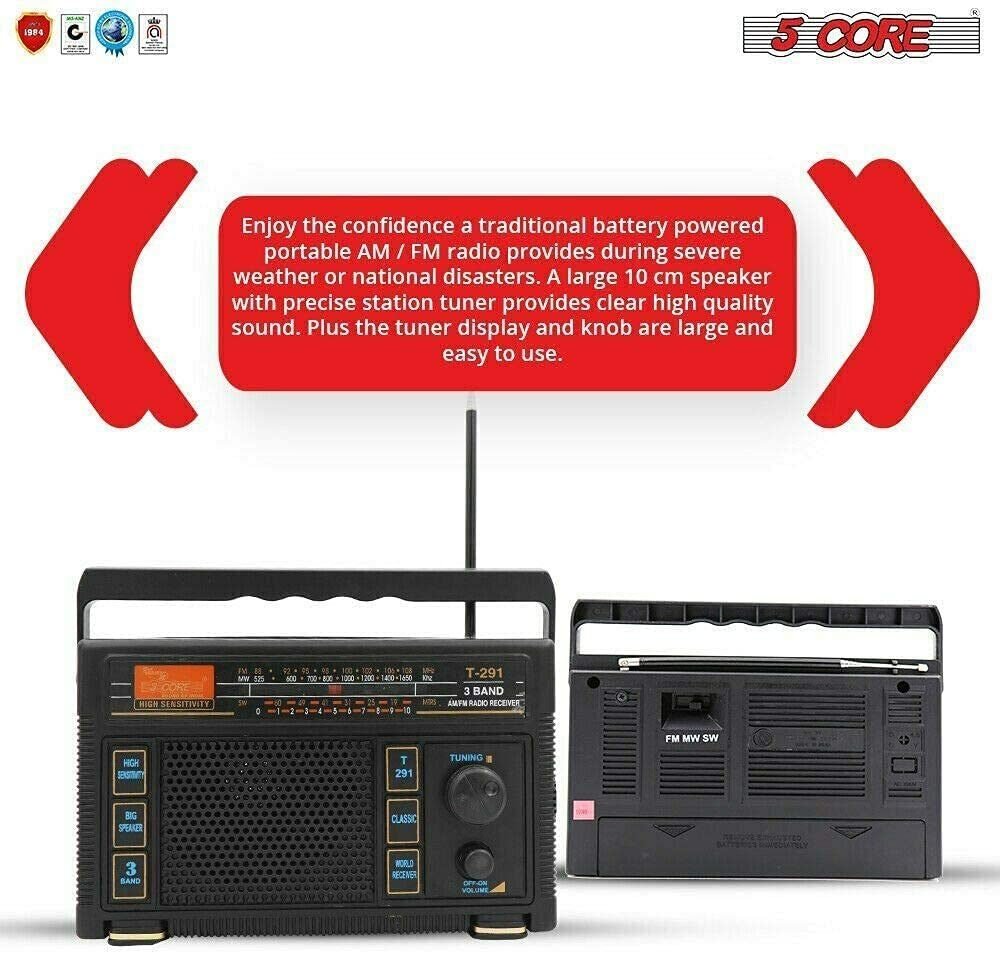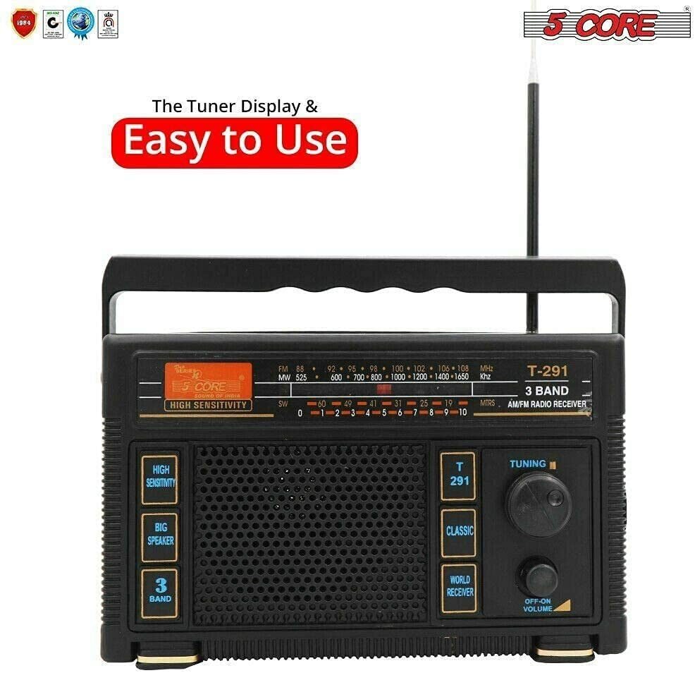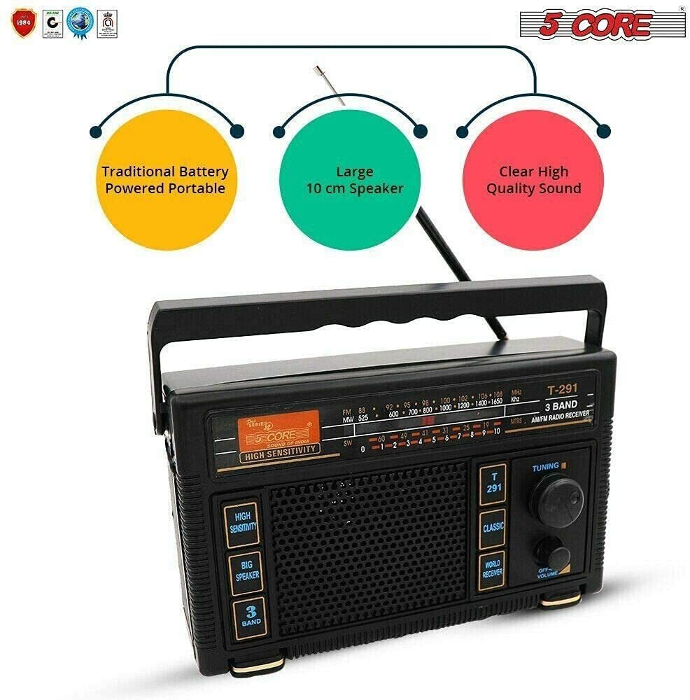 Home > 5 Core Portable Radio AM/FM Classic Vintage Battery Operated Radio Retro Transistor Best Reception Antenna Sound 3 Band Indoor and Outdoor Radio T-291