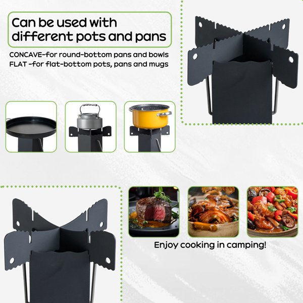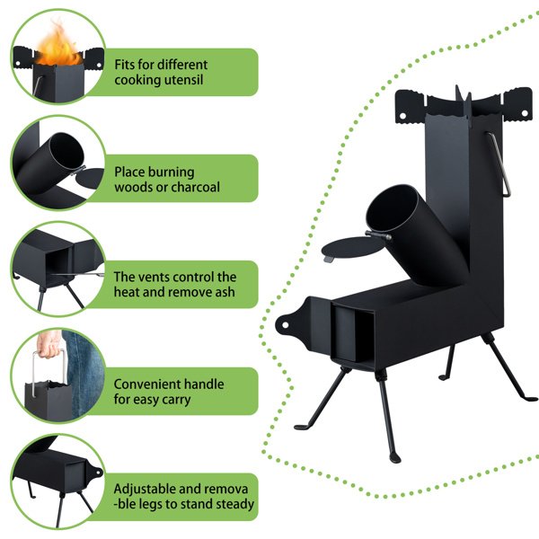 Introductions:Thiscampingrocketstoveissuitableforalloutdooractivitytimeslikehunting,fishing,picnic,camping,outdoorevents,backyardcooking,etc.Noneedtocarrypropane,gas,orotherfuelswithyou.Noneedtocarrypropane,naturalgasorotherfuels.Ahandfulofsticksandwoodblockscanbeusedtoprepareamealoutdoors.Providemoreconvenienceforyourcamping/huntingtrip.EnjoyTheViewOfBurningFireFlamesAndTheSoundOfWoodBurning!