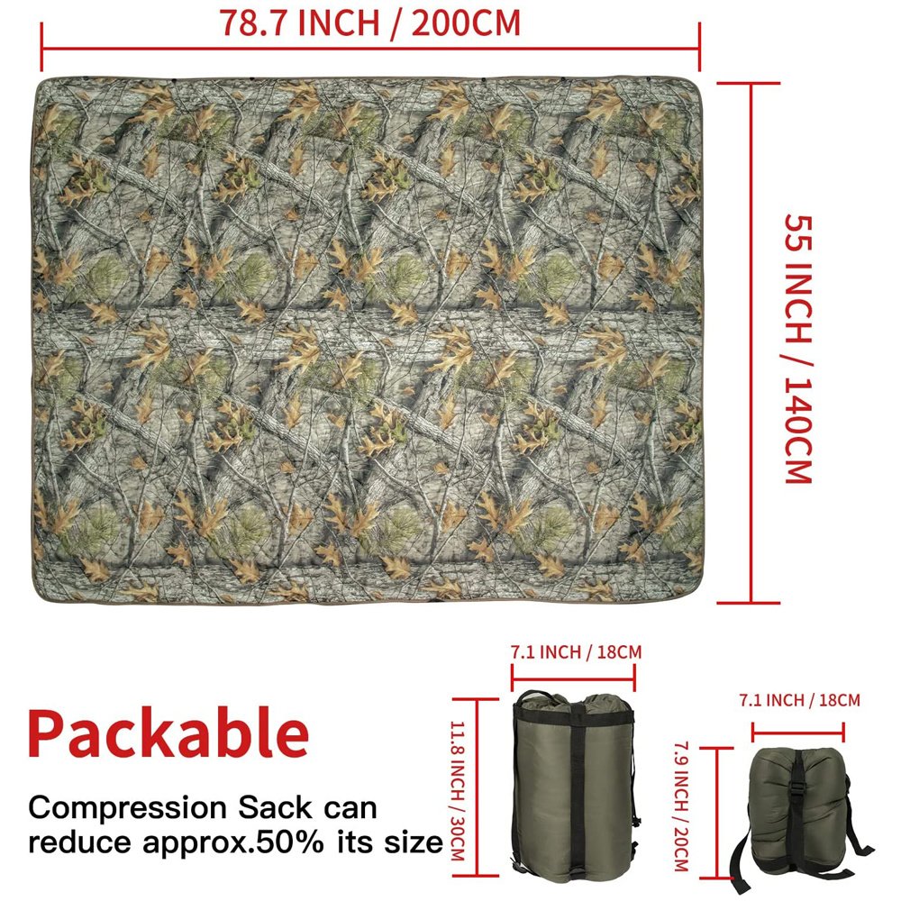 Material:210T Ripstop and filled with spray-bonded cotton WATERPROOF AND WARM BLANKET: The Woobie camo blanket is made of 210T Ripstop and filled with spray-bonded cotton; prevent water from immersion to poncho liner blanket and keep you warm and cozy; widely used in various harsh environments. One-sided with Camo Pattern; another-sided with Deep Khaki. MEASUREMENTS: This Military Emergency Poncho Liner opens up to approximately 140cm by 200cm; weighs 0.75kg and comes with matching compression sack; the bottom diameter of the compression sack is 18cm and the height is 30cm. The Blanket is packable and be fully compressed into its compression sack for easy carry and storage; reduces space and volume. MULTI-USE PONCHO LINER: Just Click the Three Premium Double Snaps can easily turn your blanket into a poncho; and keeps you hands free for chatting around the campfire; tailgating; or cozying up with your favorite book. Snaps straight into a poncho opposed to tying is a more secure attachment for sure. MULTIPURPOSE: The survival woobie blanket can be used as camping and outdoor blanket; beach mat; picnic mat; poncho; but alse a fun option at home for enjoying outdoor movie nights or fire-pits. This lightweight and compact camo blanket is great to make your camping; hiking; backpacking; picnicking; hunting; and fishing trips so much easier. PRACTICALITY: There is no more practical a piece of gear than the woobie/poncho liner! Warm but it breathes; lightweight and easy to pack; store; and wash. The waterproof army blankets can hand or machine wash; which make it are easier to maintenance.