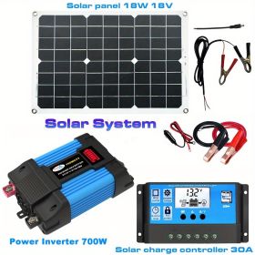 Solar Power Set 1pc 18W18V Solar Panel Waterproof Cell; 1pc 30A Charger Controller; 1pc 700W Power Inverter DC12V To AC110V Car Battery Charge; Blue